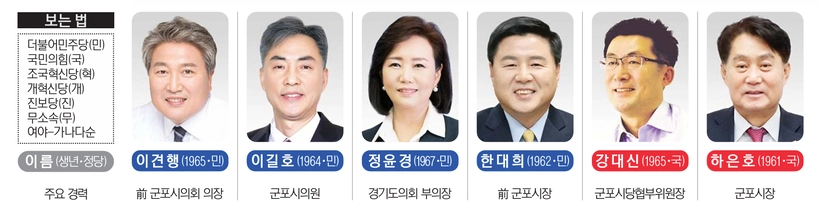 군포시는 전통적으로 진보세가 강한 지역으로 분류돼 왔다. 지방선거가 민선제로 전환된 이후 민선 1기 시장에 조원극 당시 민주당 후보가 당선됐고, 이후 새정치국민회의 간판을 내건 김윤주 전 시장이 민선 2·3·5·6기 네 차례 시장을 역임했다. 중간에 당시 한나라당 소속 노재영 전 시장이 민선 4기 시장에 한 차례 당선됐을뿐, 민선 7기에도 더불어민주당 한대희 전 시장이 시정을 이끌며 보수 진영이 좀처럼 힘을 발휘하지 못했다. 총선에서도 민주당 이학영 국회 부의장이 19대부터 현 22대까지 내리 4선을 역임하며 진보 진영 텃밭임을 입증해 왔다.