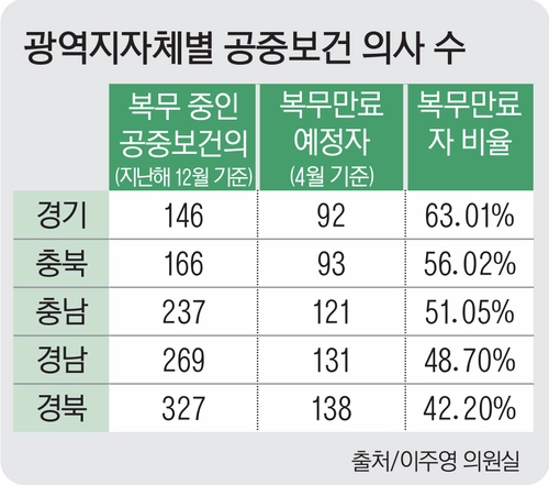 전국과 비교할 때 경기도의 공보의 전역 비율은 가장 높다. 50명 이상 공보의가 근무 중인 광역자치단체 가운데 4월 복무 만료 비율은 경기도가 63.01%로 가장 높았고, 충북 56.02%(166명 중 93명), 충남 51.05%(237명 중 121명), 경남 48.70%(269명 중 131명), 경북 42.20%(327명 중 138명), 전북 41.81%(232명 중 97명) 순으로 나타났다. 경기도는 비수도권에 비해 근무 인원은 적지만 이탈 비율이 높아, 당장 올 상반기에 기존 보건지소 체계가 흔들릴 가능성이 큰 실정이다.