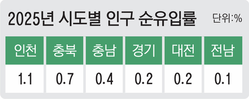 국가데이터처가 29일 낸 ‘2025년 국내 인구이동 통계’를 보면 지난해 인천시 전입 인구는 39만5천525명으로 전출 인구(36만3천261명)보다 3만2천264명이 많았다. 전입에서 전출을 뺀 인구 비율을 뜻하는 순유입률은 1.1%로 전국 1위였다. 충북(0.7%), 충남(0.4%), 경기(0.2%), 대전(0.2%), 전남(0.1%), 세종(0%)이 그 뒤를 이었다. 나머지는 전출이 전입보다 많은 순유출을 보였다.