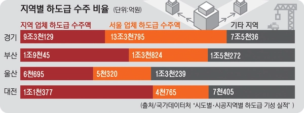 이같이 지자체의 적극적인 행정적 개입이 이어진 지역에서는 지역 업체의 수주 실적도 비교적 안정적인 흐름을 보였다. 2024년 기준 울산 건설 현장에서 발생한 하도급 총 기성액 2조5천254억원 가운데 울산 업체가 수주한 금액은 6천695억원으로 전체의 26%를 차지했다. 울산 역시 인접한 부산과 서울 소재 대형 전문업체와의 경쟁 부담은 존재하지만 지역 내 1위 비중은 유지하며 점진적인 확대 흐름을 보이고 있다.
