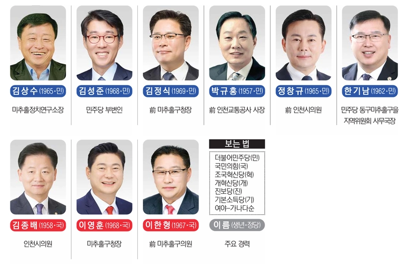 더불어민주당에서는 김상수 미추홀정치연구소장, 김성준 더불어민주당 부대변인, 김정식 전 미추홀구청장, 정창규 전 인천시의원, 한기남 동구미추홀구을 지역위원회 사무국장 등 5명이 출사표를 던졌다.