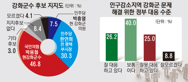 인천 강화군의 인구 감소 문제를 해결하려면 ‘청년 유입 지원책 마련’과 ‘일자리 창출’을 우선적으로 추진해야 한다는 의견이 많았다. 6·3 지방선거 강화군수 후보 지지도 조사에선 국민의힘 소속 박용철 강화군수가 오차범위 밖 선두를 차지했다.