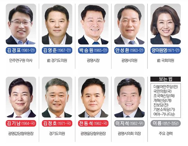 김기남 광명갑 당협위원장과 전동석 광명을 당협위원장 등도 지역 정가의 주목을 받고 있는 인물들로, 광명 정치지형을 바꿀 수 있을 것인가에 이목이 집중된다.