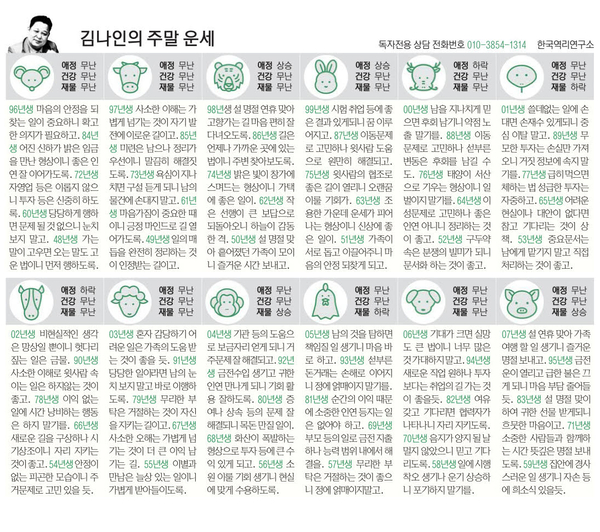 未(양띠)=03년생 혼자 감당하기 어려운 일은 가족의 도움 받는 것이 좋을 듯. 91년생 당당한 일이라면 남의 눈치 보지 말고 바로 이행하도록. 79년생 무리한 부탁은 거절하는 것이 자신을 지키는 길이고. 67년생 사소한 오해는 가볍게 넘기는 것이 더 큰 이익 남기는 길. 55년생 이별과 만남은 늘 있는 일이니 가볍게 받아들이도록.