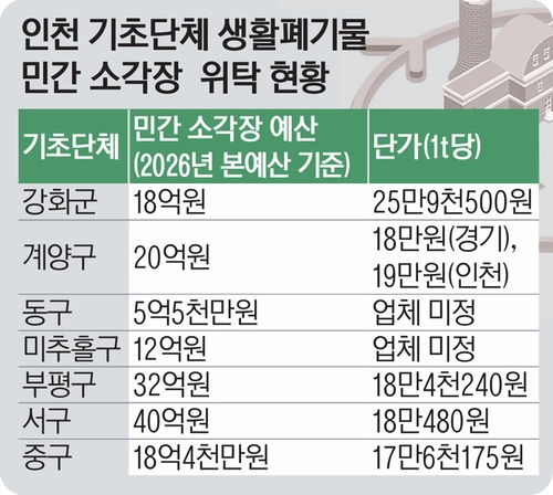 특히 인천 기초단체의 민간소각장 처리비용은 1t당 평균 19만1천262원으로, 경기(12만9천26원), 서울(15만7천157원)보다 비쌌다. 지난해 인천의 공공(송도·청라) 소각장 처리 비용은 1t당 12만6천원, 수도권매립지 매립은 1t당 11만6천원 수준이었다. 올해 민간소각장 위탁으로 생활폐기물 처리를 위한 인천 기초단체의 예산 부담이 평균 65% 정도 증가한 셈이다.