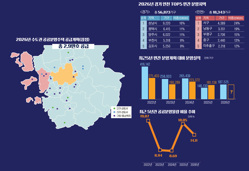 2026년 경인지역 분양 캘린더는 유난히 촘촘하다. 2·3기 신도시 물량을 중심으로 공공과 민간분양을 합쳐 11만 가구 안팎의 공급 계획이 월별로 채워졌지만 시장의 관심은 숫자보다 계획이 실제 분양으로 이어질 수 있을지에 쏠린다. 고금리·고환율에 요동치는 정부의 부동산 정책까지 더해지며 현장의 셈법도 복잡해지고 있다.