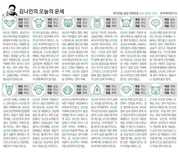 酉(닭띠)=05년생 아무리 돈이 궁해도 자신을 망가뜨리는 행동은 하지 말아야. 93년생 지나친 과소비로 금융문제 생기니 돈은 있을 때 아껴야 하는 법. 81년생 명절증후군으로 부부이성간 다툼생기니 잘 풀어가도록. 69년생 새로운 직업 원하나 투자 등은 불리하니 조심하도록. 57년생 남의 꾐에 빠지면 손해 보게 되니 문서거래 신중히 하도록.