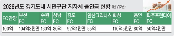 지자체가 출자해 운영하는 시민구단에는 매년 막대한 예산이 투입된다. 올해 경기도와 도내 9개 지자체들이 각 시민구단에 지원하는 보조금만 832억3천만원에 달한다. 대부분 시에서 보조금 또는 출연금을 본예산에 편성해 지원하는 형태다.