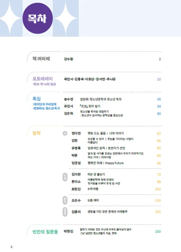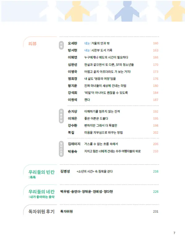 이번 호에도 청소년이 읽기 좋은 시, 소설, 희곡, 에세이 작품들이 다양하게 실렸습니다. 서평을 통해서는 읽을 만한 책을 고르면서 책 읽기의 즐거움을 느낄 수 있을 것 같고요. ‘우리들의 네칸’, 영국 드라마 ‘소년의 시간 감상기’를 다룬 ‘우리들의 빈칸’ 등 청소년들이 참여하는 코너에서 생각을 공유할 수도 있습니다. 청소년들의 생각을 직접 읽을 수 있는 앙케이트 ‘빈칸의 질문들’ 또한 색다른 시도입니다.