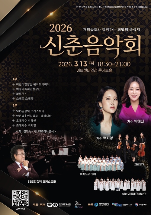 인천글로벌시티는 오는 13일 오후 6시 30분 아트센터인천 콘서트홀에서 ‘2026년 신춘음악회’를 개최한다. ‘재외동포와 함께하는 희망의 속삭임’이란 부제가 달린 이번 공연은 재외동포와의 문화 교류를 통해 지역사회 연계를 강화하겠다는 취지도 담겼다.