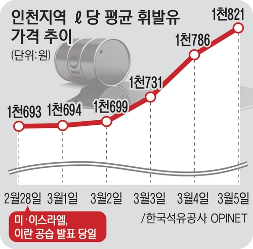 미국과 이스라엘이 이란 주요 시설을 타격했다는 내용을 공식 발표한 지난달 28일 기준 인천 휘발유 가격은 1천693원이었다. 지난 2일까지만 해도 1천600원대 후반을 유지했지만, 다음날 1천731원으로 급등한 뒤 이틀 동안 90원이 뛰었다. 이날 인천지역 주유소 가운데 1천600원대에 휘발유를 파는 곳은 단 1곳에 그쳤다. 땅값이나 임대료가 상대적으로 비싼 도심지역은 1천800원대가 대다수였고, 일부 주유소는 2천원이 넘는 가격을 내걸기도 했다.