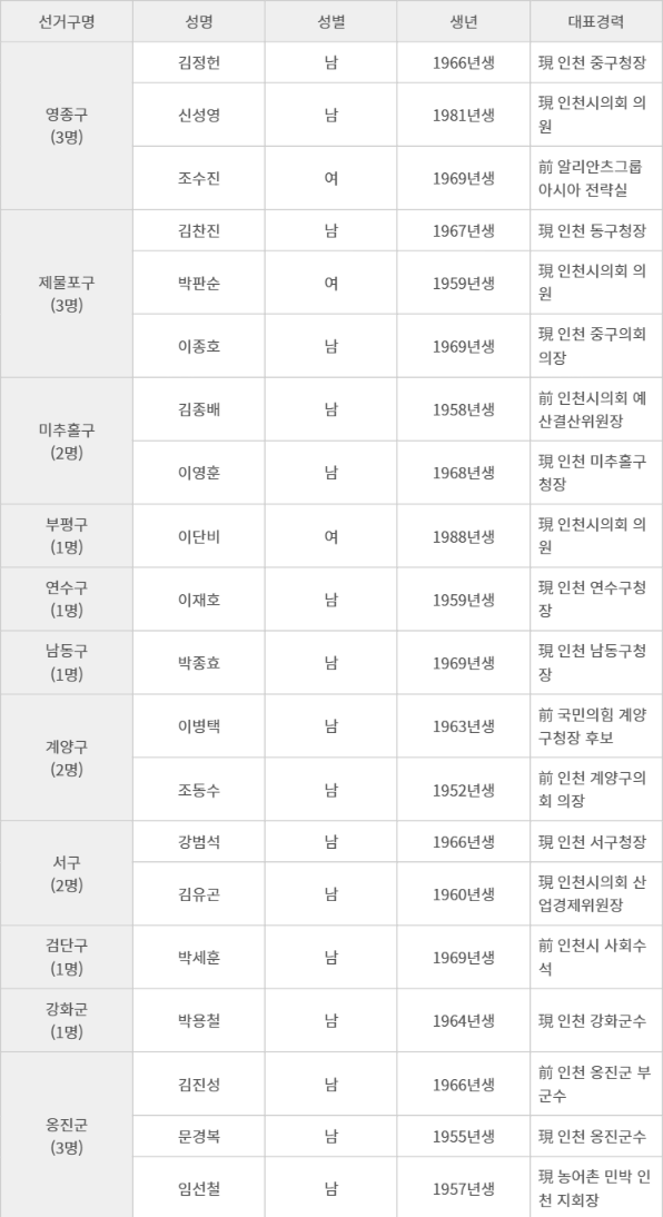 신청 현황을 보면 영종구청장 3명, 제물포구청장 3명, 미추홀구청장 2명, 연수구청장 1명, 남동구청장 1명, 계양구청장 2명, 서구청장 2명, 검단구청장 1명, 강화군수 1명, 옹진군수 3명 등이다. 중앙당 공천관리위원회가 받은 부평구청장 후보자 공모에는 1명이 신청했다.