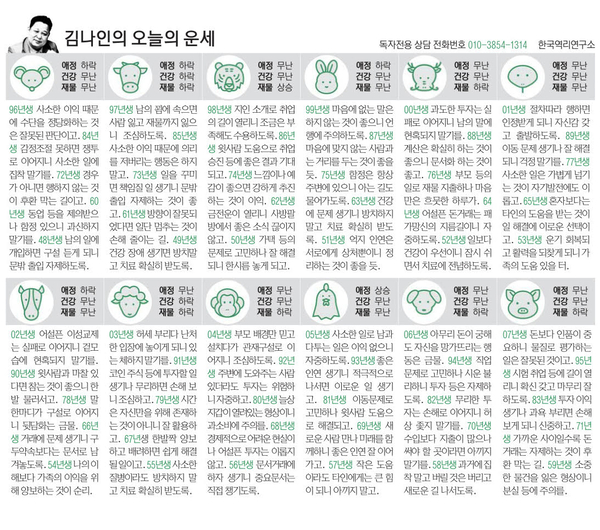 亥(돼지띠)=07년생 돈보다 인품이 중요하니 물질로 평가하는 일은 잘못된 것이고. 95년생 시험 취업 등에 길이 열리니 확신 갖고 마무리 잘 하도록. 83년생 투자 이익 생기나 과욕 부리면 손해 보게 되니 신중하고. 71년생 가까운 사이일수록 돈 거래는 자제하는 것이 후한 막는 길. 59년생 소중한 물건을 잃은 형상이니 분실 등에 주의를.