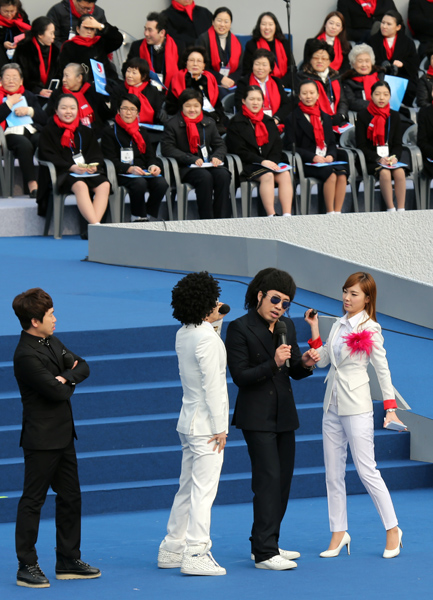 현재 시대를 상징하는 장면은 '말춤'으로 세계적인 스타로 발돋움한 가수 '싸이'가 표현했다. 싸이는 '챔피언'에 이어 자신의 최대 히트곡인 '강남 스타일'을 개사해 말춤과 함께 선보였다.