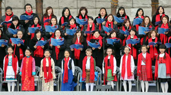 오전 9시20분부터 한바탕 신바람나는 사물놀이가 이어진 뒤 김영임 명창이 민요합창단과 함께 '쾌지나 칭칭나네'를 박 대통령의 국정철학에 맞춰 개사한 노래를 부르며 흥을 돋웠다.