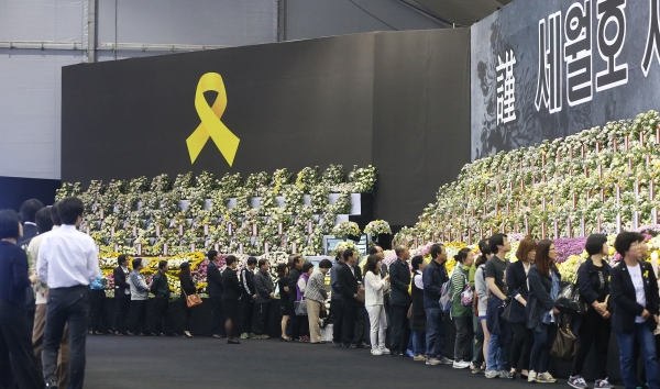 | ▲ 9일 오후 경기도 안산시 단원구 초지동 화랑유원지 내 세월호 사고 희생자 정부 합동분향소에서 추모객들이 국화를 들고 줄지어 있다. /연합뉴스 |