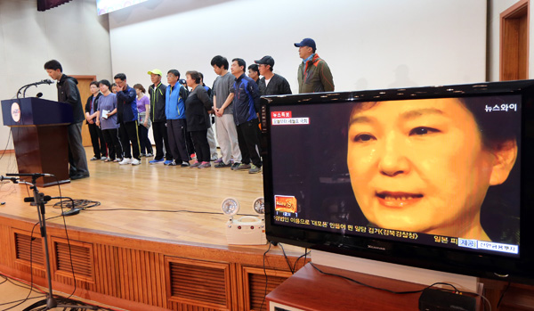 | ▲ 세월호 침몰 사고 34일째인 19일 오전 전남 진도군 진도 실내체육관에서 실종자 가족들이 박근혜 대통령의 세월호 참사와 관련한 대국민담화를 시청하고 있다. /연합뉴스 |